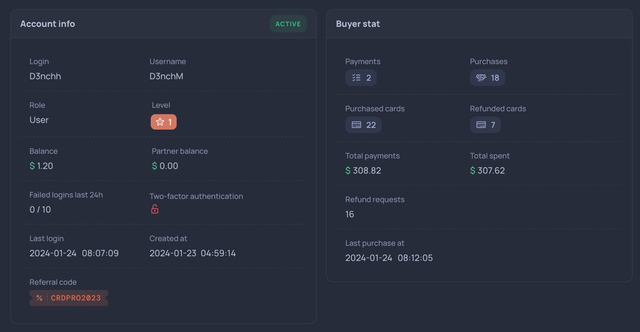 Price: from $15 (non-ref prepaid & classic debit) to $25 (credit) ➕ REF / Extra: Email, Phone, Zip, Holder, Ip, User-Agent