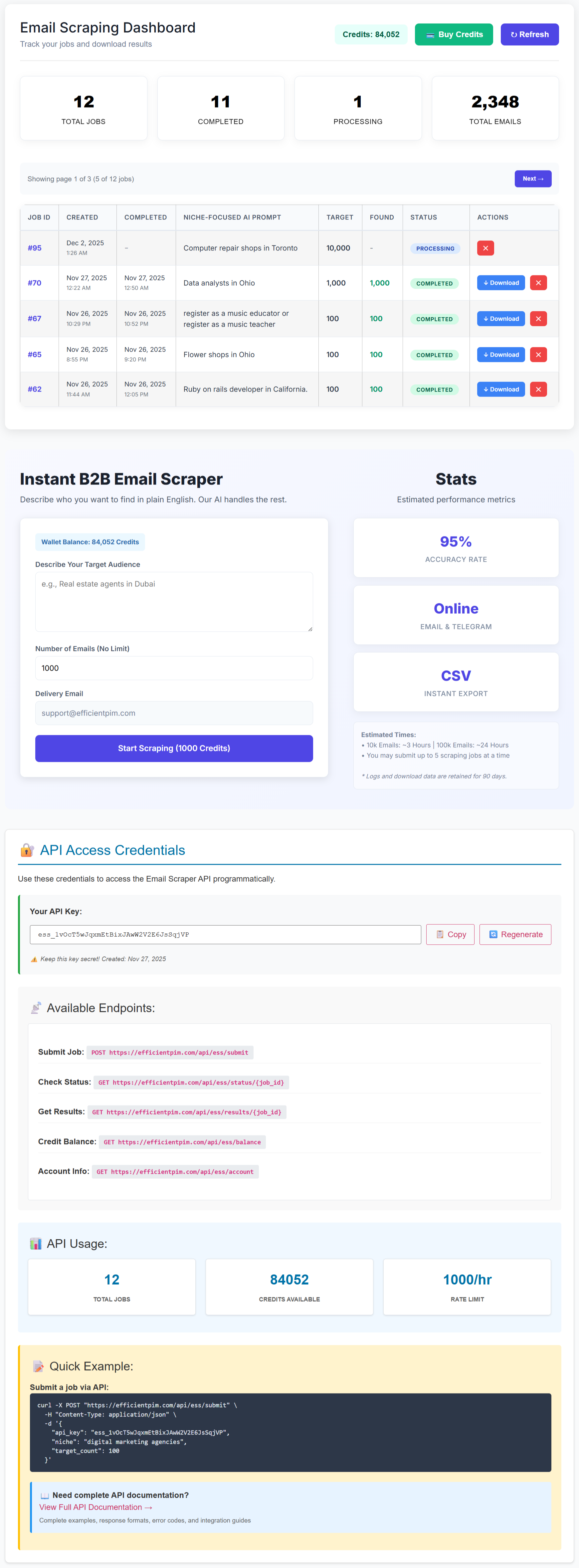 A: Yes, we provide a comprehensive REST API with detailed documentation for seamless integration. Developers can connect our email scraping service directly into their applications, CRMs, or marketing automation tools. The API supports all the same features as our web interface, including custom targeting, real-time verification, and webhook notifications when your lists are ready.
