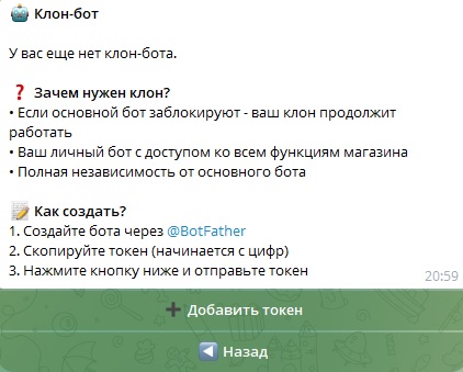 6) !!Bot cloning system for the client!! Any of your clients has a Clone bot button in the start message for cloning your bot, and if your main Telegram bot gets blocked, the client's clone will work.