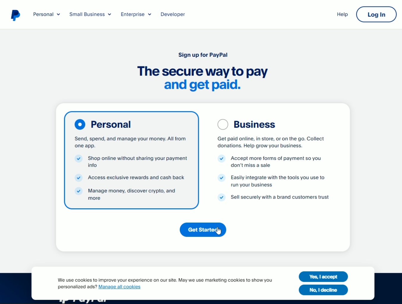 Select Personal account, specify your e-mail, phone number and password