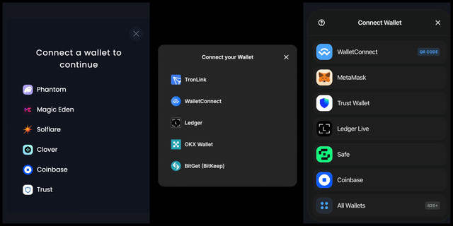 - Metamask, TrustWallet, Coinbase Wallet, Binance Wallet, Wallet Connect ~440 wallets (https://explorer.walletconnect.com)