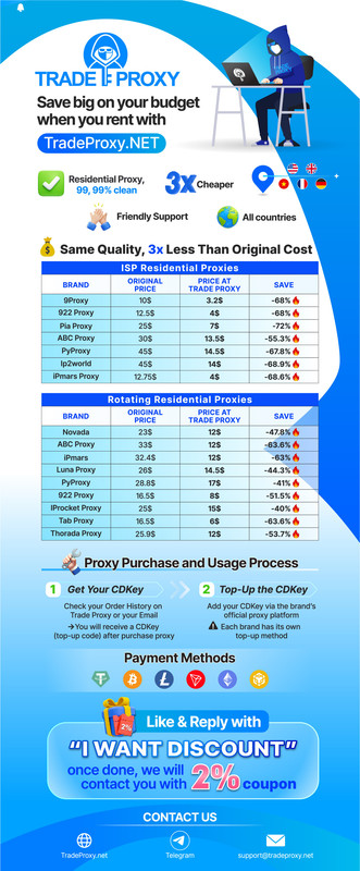 TRADEPROXY.NET, brings together the most trusted proxy providers such as 9Proxy, PiaProxy, LunaProxy, ABCProxy, 922Proxy… in one place!